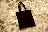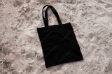 Black cotton or mesh bag on beach sand background. Zero waste, no plastic, eco friendly shopping, recycling concept. Blank mockup shopper with place for artwork or text. Flat lay, copy space