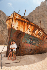 young couple in a beach with shipwreck