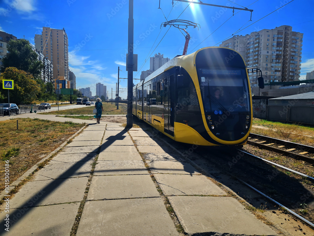 A modern yellow tram travels along the city rails.