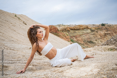 Full length portrait of a young woman posing in the Padovskiy quarry