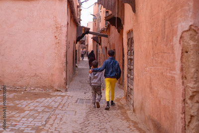 Two brothers walk down street, older one affectionately embracing younger, view from behind, family love, authentic urban African landscape, daily activities