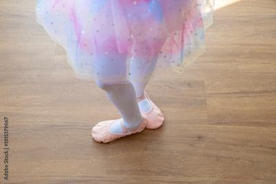 little girl, Small ballet dancer, young ballerina in pink ballet tutu practices first basic positions with careful attention to technique