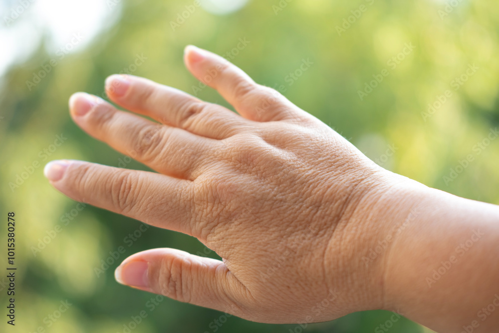 Close-up wrinkled mature female hand, palm against soft green background, Nature and Aging gracefully, essence aging and richness life experiences