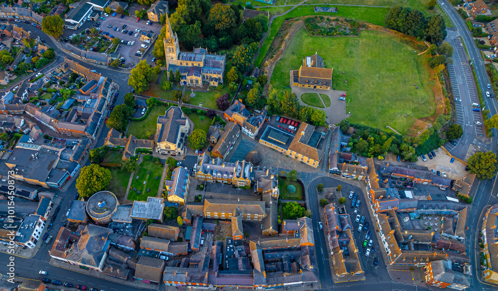 Aerial view of All saint church in Oakham, a market town and civil parish in Rutland in the East Midlands of England