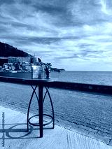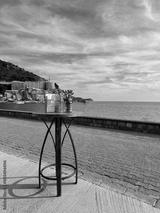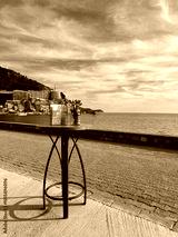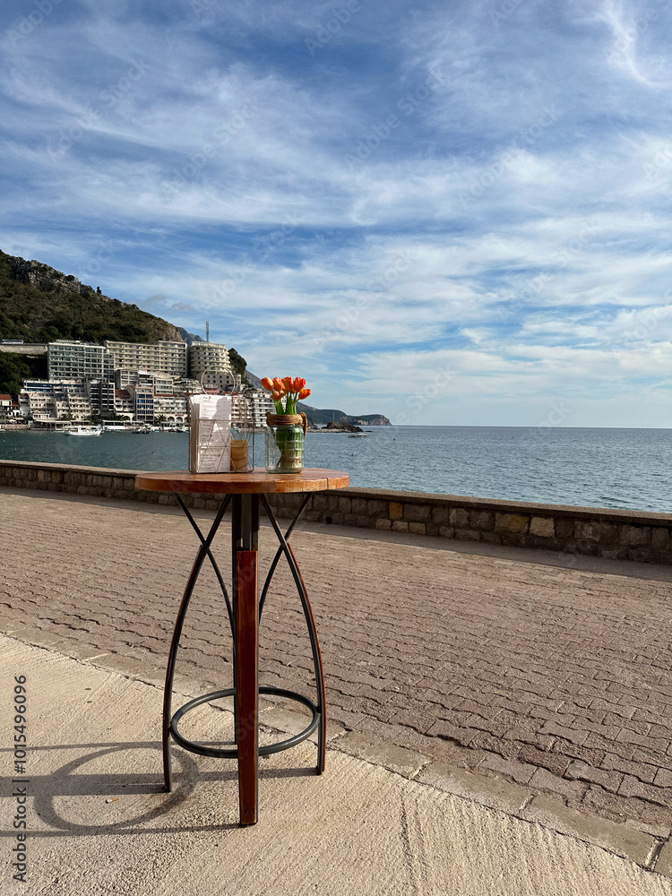 A table with a bouquet of tulips and a stack of menus on the embankment of Rafailovici