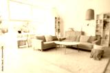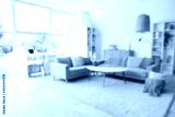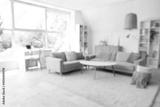 Blurred view of light living room with grey sofas, table and shelf units