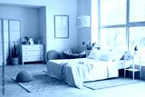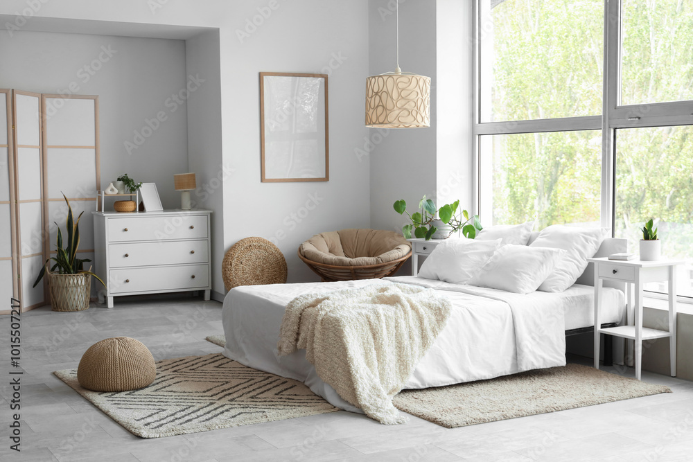 Modern interior of light bedroom with chest of drawers, bedside table and bed