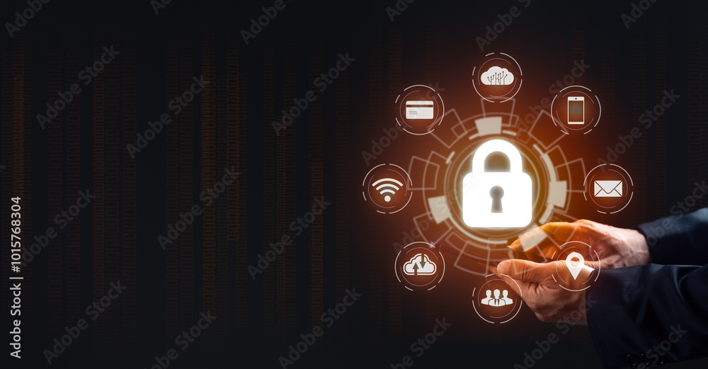 Businessmen protecting personal data on mobile phone and virtual interfaces. Cybersecurity and privacy concepts to protect data. Lock icon and internet network security technology.
