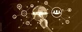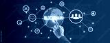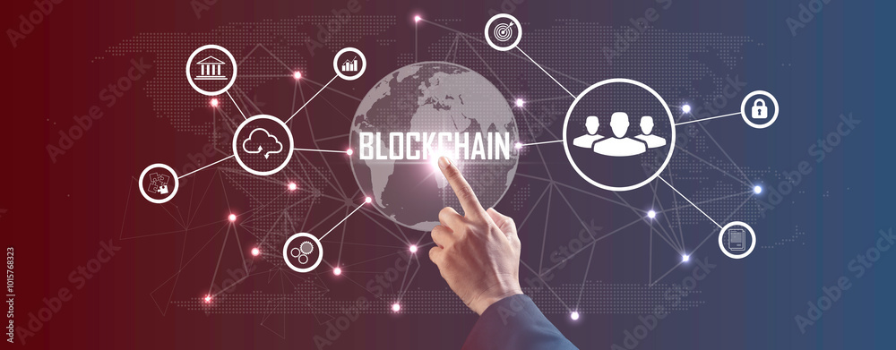 Hand touching a smart contract and executing a cryptocurrency transaction with blockchain technology. The transaction is secure and transparent, and there are other people in the background.