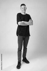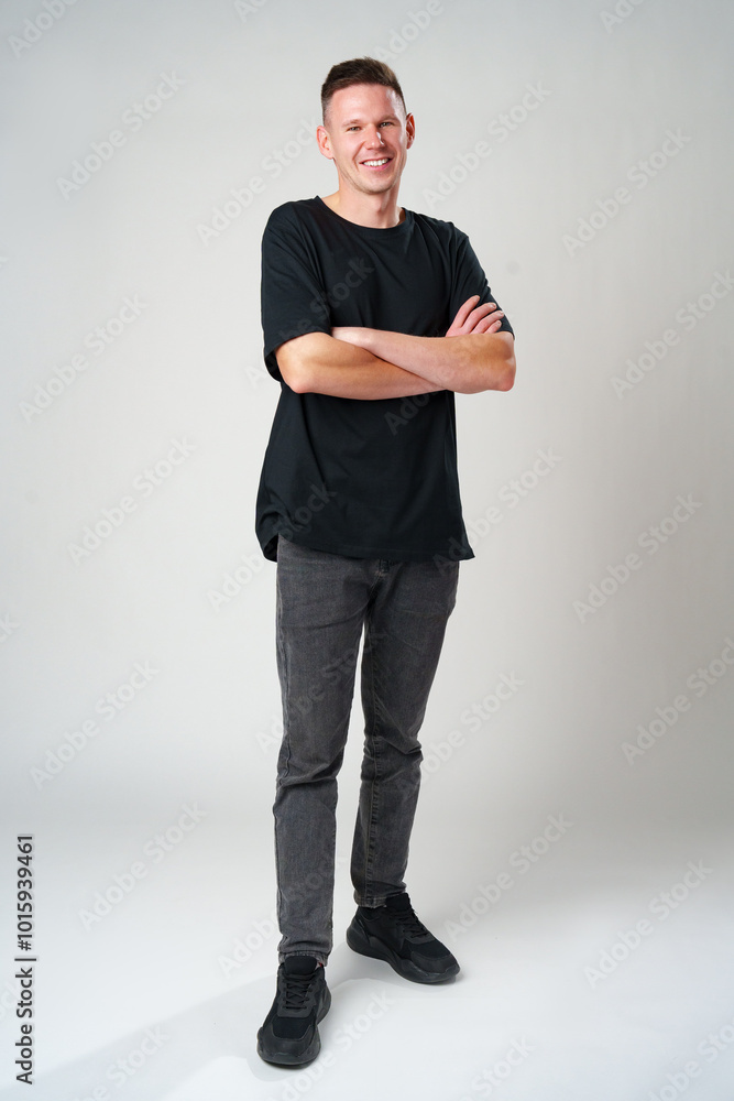 Full length portrait of young smiling man wearing casual clothes on gray background