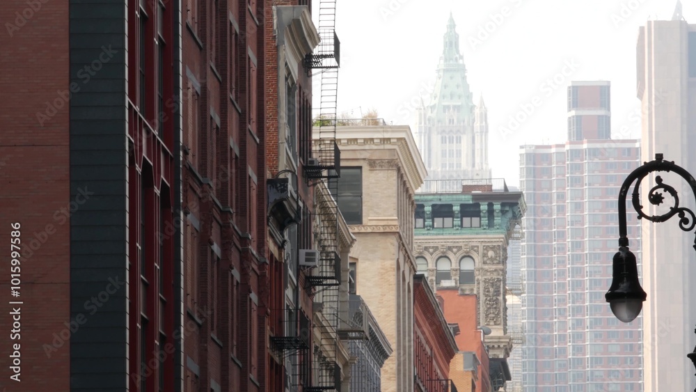 New York City Manhattan Soho fashion district near Broadway street. USA urban building facade, old american architecture. Shopping in NYC, United States. Business and residential real estate. Lantern.