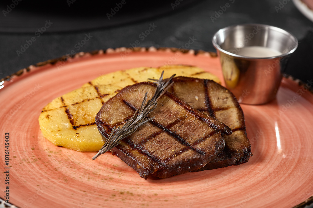 Grilled Beef Tongue with Potatoes Creative Culinary Presentation with Warm Tones
