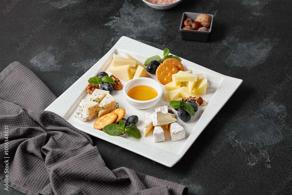 Elegant Cheese Platter with Grapes and Nuts on Dark Stone Background