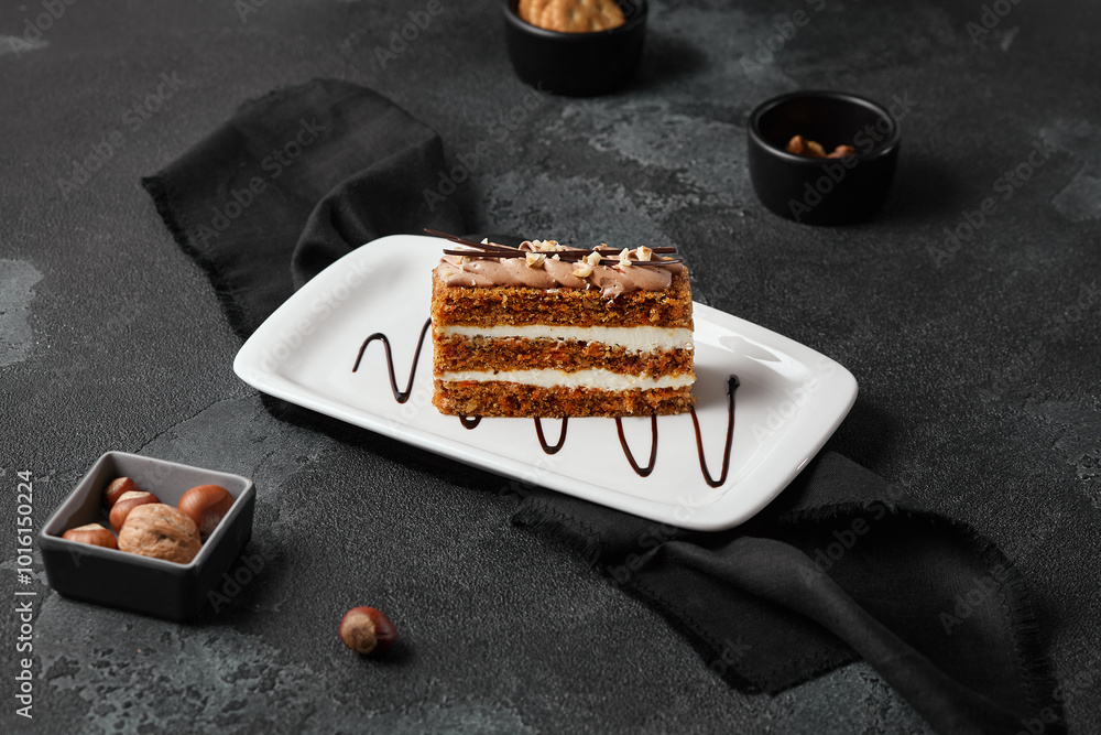 Elegant Slice of Carrot Cake with Nuts and Chocolate Drizzle on Dark Rustic Background