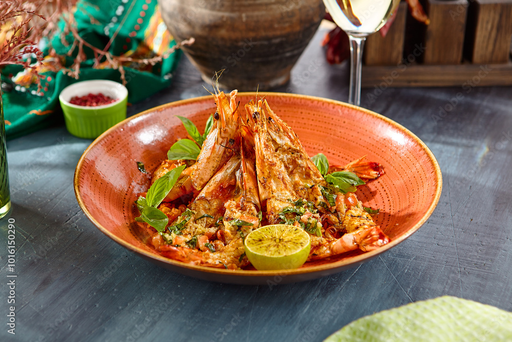 Grilled Shrimp with Lime on Elegant Plate – Close-Up Gourmet Seafood Cuisine