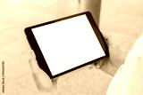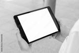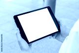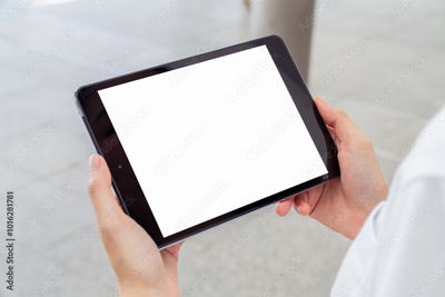 Mock up of female hand holding digital tablet blank screen on isolated. Take your screen to put on advertising.