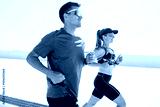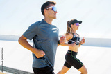 Two Runners Enjoying a Bright Sunny Day While Exercising Along a Waterfront Promenade in the Early Morning Hours