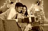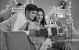 Family couple celebrates Valentine Day at home, with the husband presenting wife with a surprise gift box. Loving moment reflects bond, affection, and joy during this romantic holiday.
