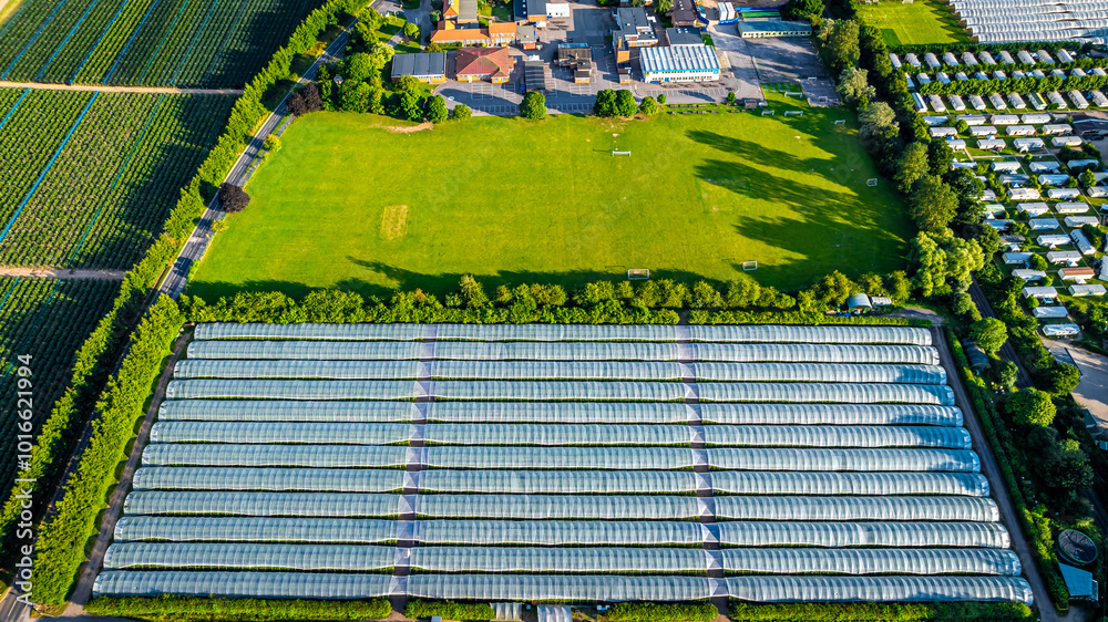 Aerial view of industrial greenhouse farms in agricultural part of England