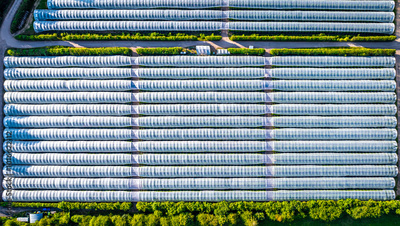 Aerial view of industrial greenhouse farms in agricultural part of England