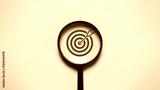 Red Target board inside of magnifier glass for focus business objective on yellow background and copy space.