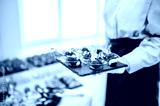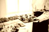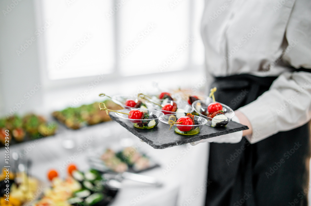 A waiter in a white shirt and black apron holds a tray of appetizers with cherry tomatoes and mozzarella at a catered event. background shows a blurred crowd, indicating a busy and lively atmosphere.