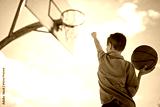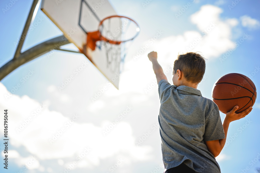 sporty boy wear grey sports clothes play basketball game on playground court