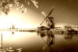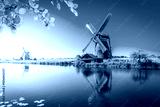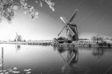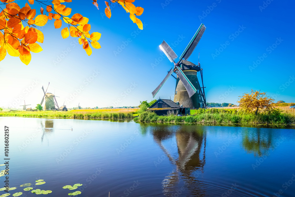 traditional dutch windmill with reflection at water, Kinderdijk at fall day, Netherland