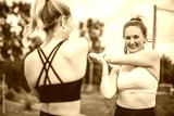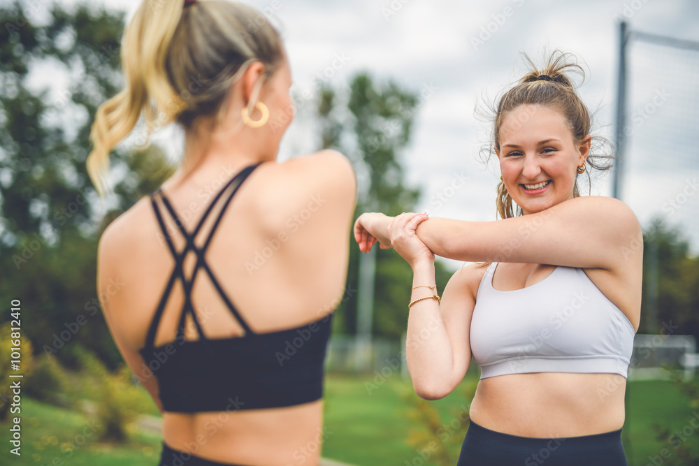 Healthy two sporty young girls jogging and stretching outdoors