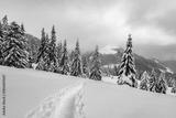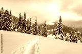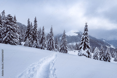Winter mountains. Snowy forest and cloudy sky. Landscape photography