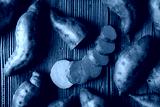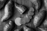 Pink organic raw sweet potatoes, whole and sliced, on wooden rustic table close up