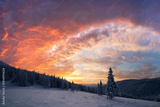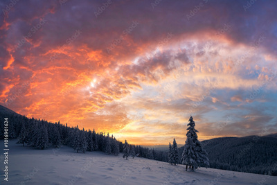 Incredible sunset in snowy mountains. Dramatic wintry scene with snowy trees glowing by sunlight. Christmas holiday concept