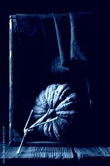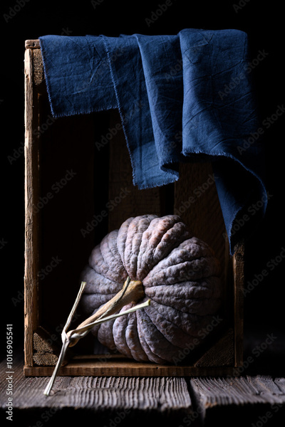 Heirloom Japanese pumpkin Black Futsu squash on wooden box with blue napkin close up
