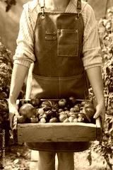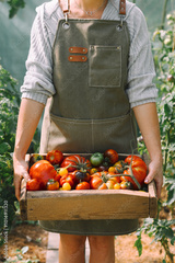 Female farmer holds ripe tomatoes in a wooden box, harvested from a greenhouse. Home gardening concept