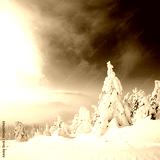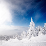 Covered with snow fir-trees in the high mountains. Fairy winter forest. Natural landscape with beautiful blue sky