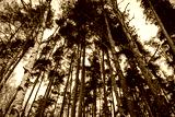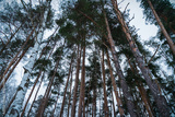 coniferous trees and birches in the winter forest, bottom view