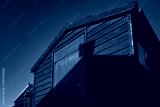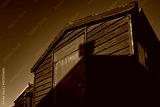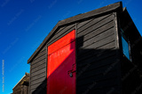 Bright red painted door seen on small coastal cabin in the east of England. The huts are used by fisherman for storage.