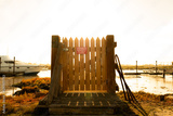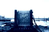 Contrasty view of a wooden gate leading to a private jetty on an inland waterway. A moored boat can be seen on the left.