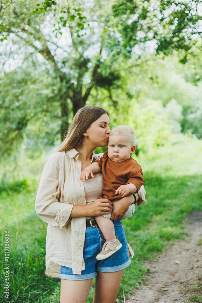A young mother holds her little son in her arms and walks in the park. A walk of a mother with her son.