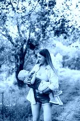 A young mother holds her little son in her arms and walks in the park. A walk of a mother with her son.