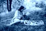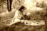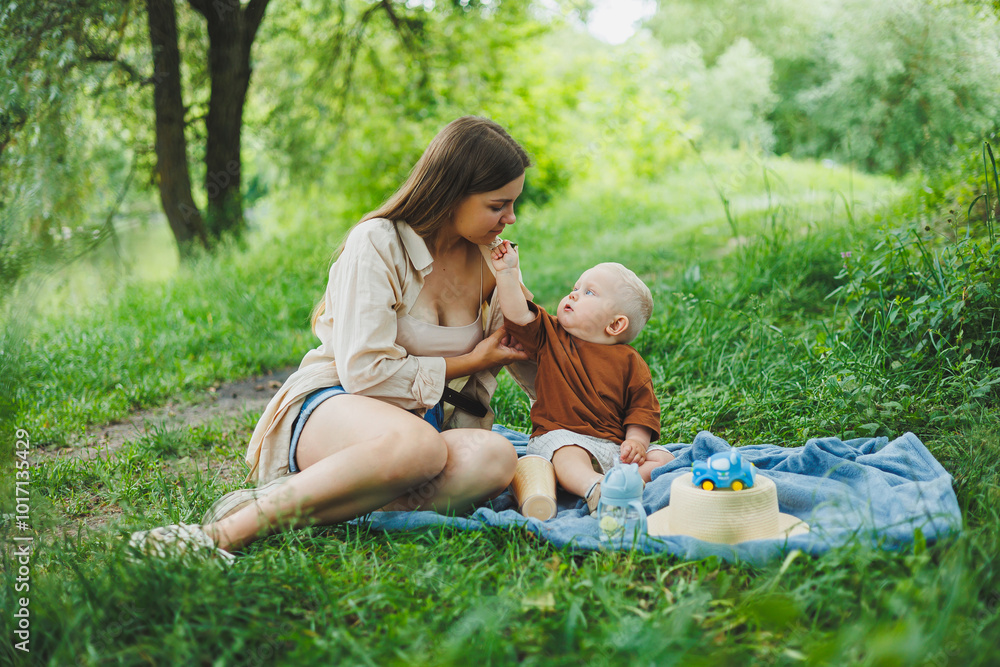 Mother's time with her little son. A young mother is sitting on the grass in the park. A walk of a mother with her son.