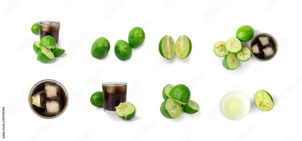 Cola whiskey cocktail, Cuba Libre with rum, cola and lime, squeezing out half green lemon on white