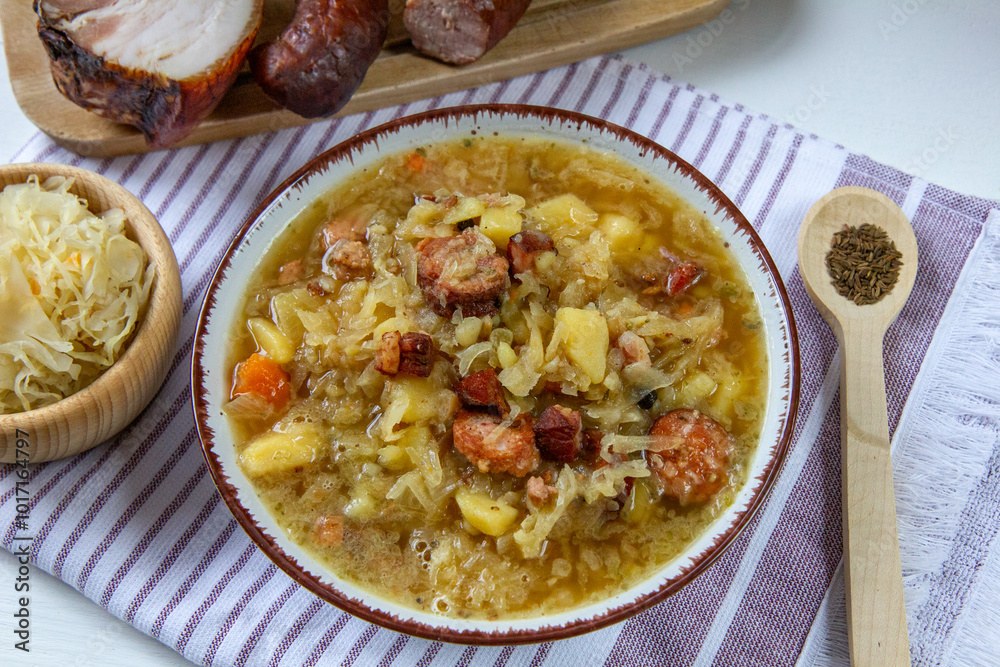 Kapuśniak - domowa, tradycyjna polska zupa z kiszonej kapusty z ziemniakami, boczkiem i kiełbasą