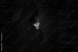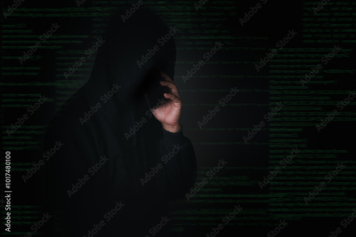 A hooded hacker is making a covert phone call, symbolizing cybercrime or identity theft planning.