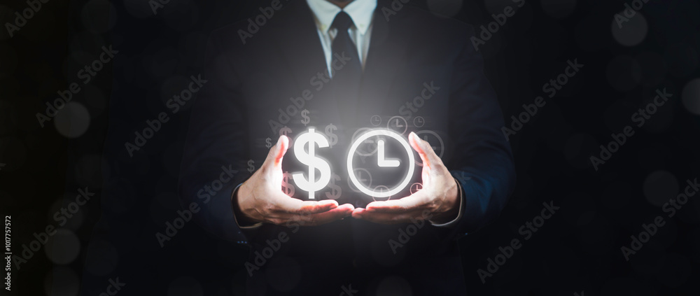 Businessman showing clock icon and dollar sign on his palm against dark background. Work life balance concept.
