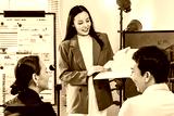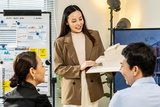 Architects and designers work presenting and discussing house model in office meeting. The participants are engaged in an in-depth conversation, Experts look at model homes and architectural drawings