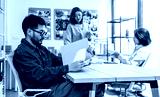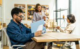 Successful Asian Businessman sitting looking in data file in Modern Office Working on Financial, Business and Marketing Projects, Behind her business team discussing and brainstorming on project