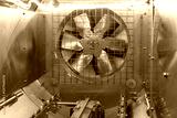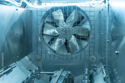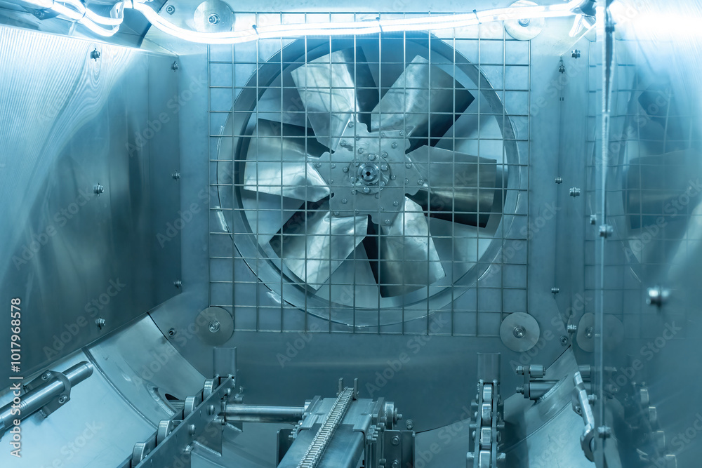 Equipment for food production. Dryer exhaust fan. Machine for evaporating excess moisture in factory. Exhaust fan near conveyor line with wheels. Equipment for production of semi-finished products