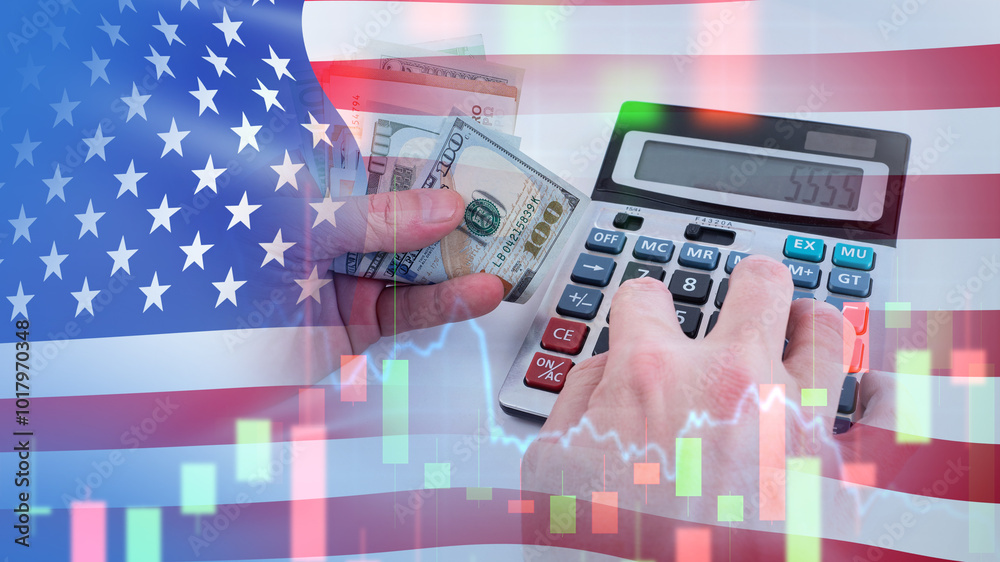 Accounting services in US. Money calculators in hands business man. Flag United States of America. Accounting in US. Profit fluctuation chart. Accounting calculation of income. US financial system.