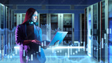 Woman is standing in server room. System administrator at work. Head of hosting company. Woman manages servers using laptop. DATA center manager. System administrator career. It server load charts